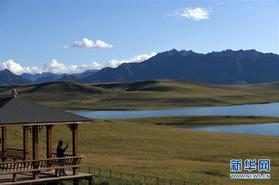 9月10日,游客在山丹马场鸾鸟湖畔赏景拍照。 新华社记者 马宁 摄