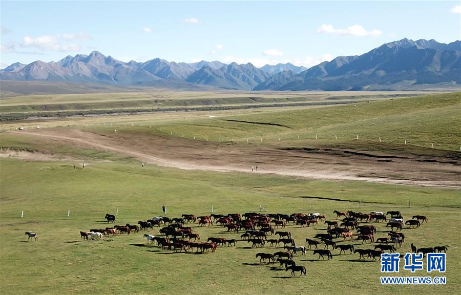 9月10日无人机在山丹马场拍摄的祁连山下的马群。新华社记者 马宁 摄