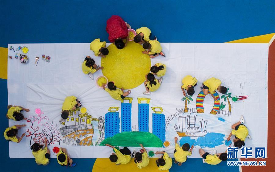 9月11日,孩子们在老师的带领下绘制家乡新面貌(无人机拍摄)。新华社记者 徐昱 摄