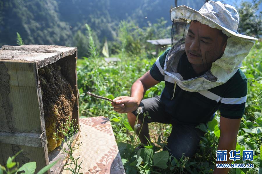 龙先兰在十八洞村一处蜜源点清理蜂箱里的虫子(9月4日摄)。新华社记者 陈泽国 摄