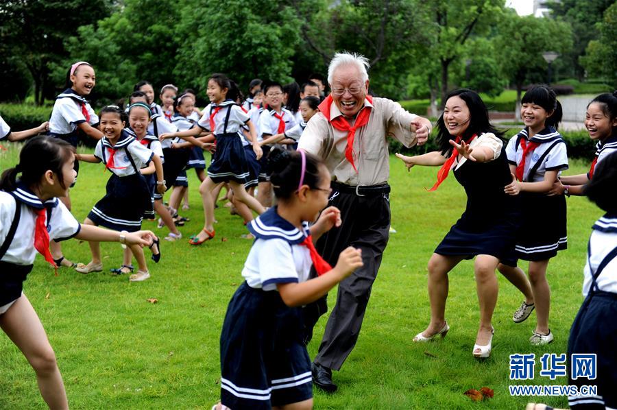 俞明德和师生玩起老鹰捉小鸡游戏(资料照片)。 新华社发(朱海伟 摄)