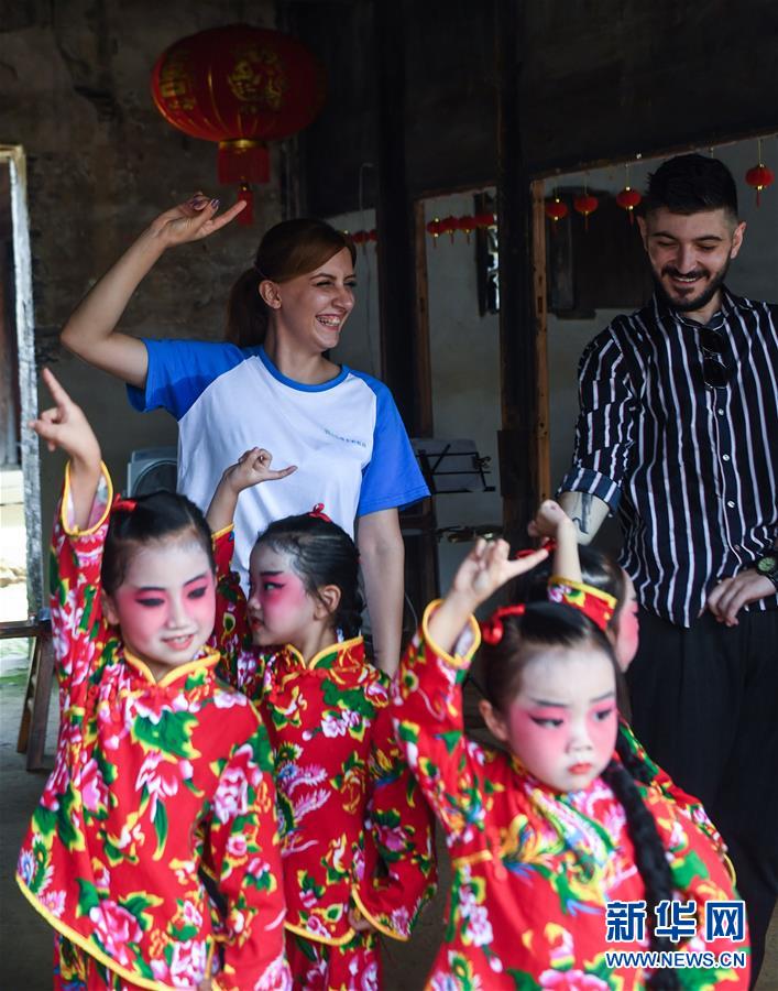 9月11日,外国友人跟着小浦镇当地幼儿园“小京迷”表演队的孩子们学演京剧。新华社记者 徐昱 摄