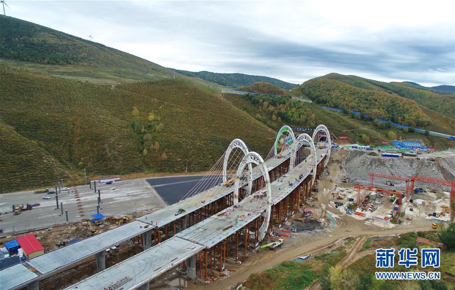 9月11日,工人在延崇高速张家口市崇礼区太子城互通式立交桥段施工(无人机拍摄)。 新华社记者 杨世尧 摄