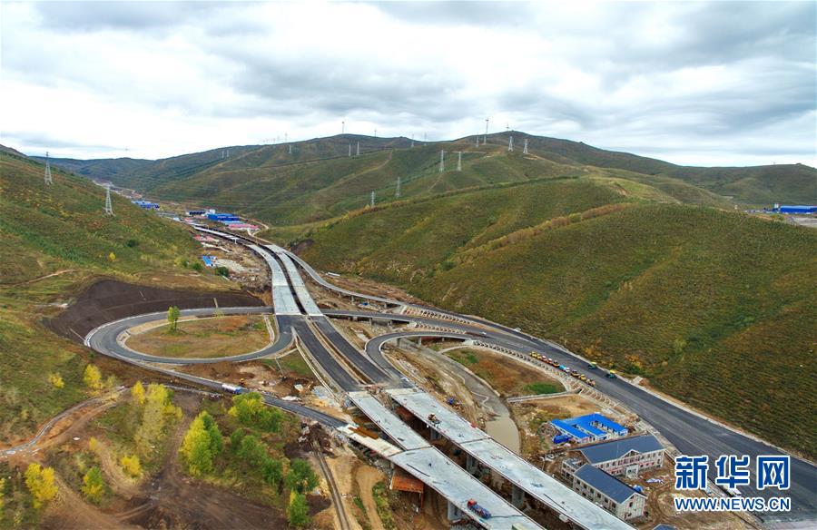 9月11日,工人在延崇高速张家口市崇礼区太子城互通式立交桥段施工(无人机拍摄)。新华社记者 杨世尧 摄