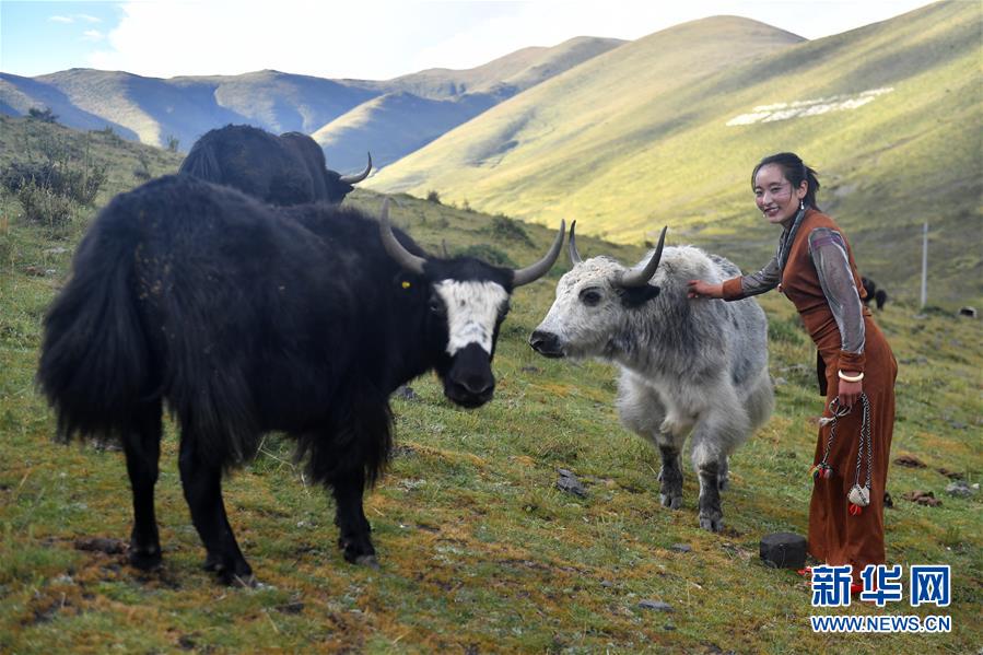 9月8日,在四川省康定市呷巴乡俄达门巴村附近,藏族姑娘根翁和自家的牦牛一起拍照。新华社记者 孙瑞博 摄
