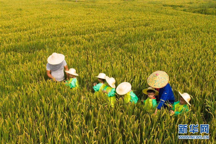 9月11日,湖州市东林镇种粮大户尚年军(左一)带着东林镇中心幼儿园的小朋友在稻田里近距离观看成熟的水稻(无人机拍摄)。新华社记者 徐昱 摄