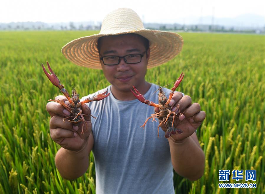 9月11日,湖州市东林镇种粮大户尚年军在稻虾共生的稻田里展示收获的小龙虾。新华社记者 徐昱 摄