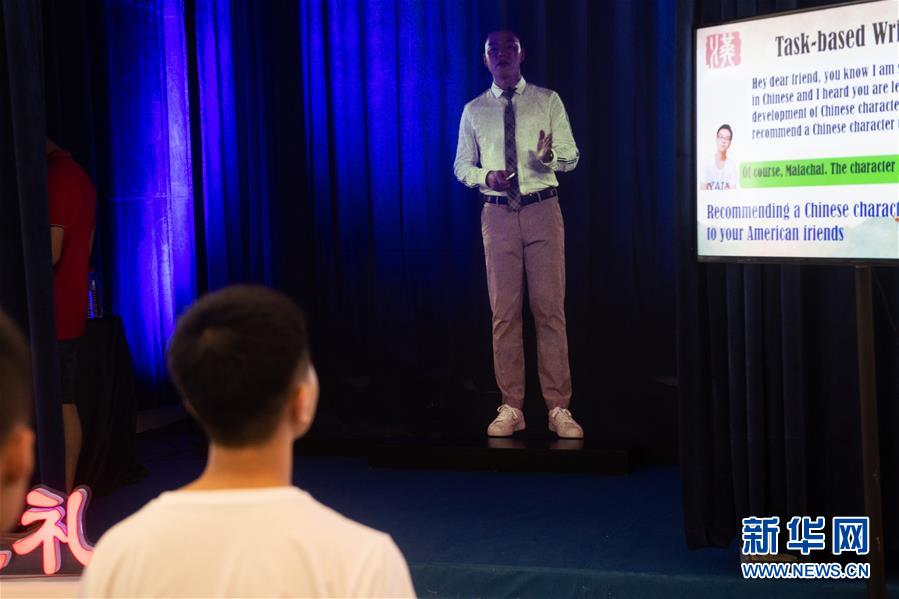 9月10日,观众在湖南长沙举行的2019世界计算机大会产品展上体验“5G+全息远程互动教学”。新华社发(陈思汗 摄)