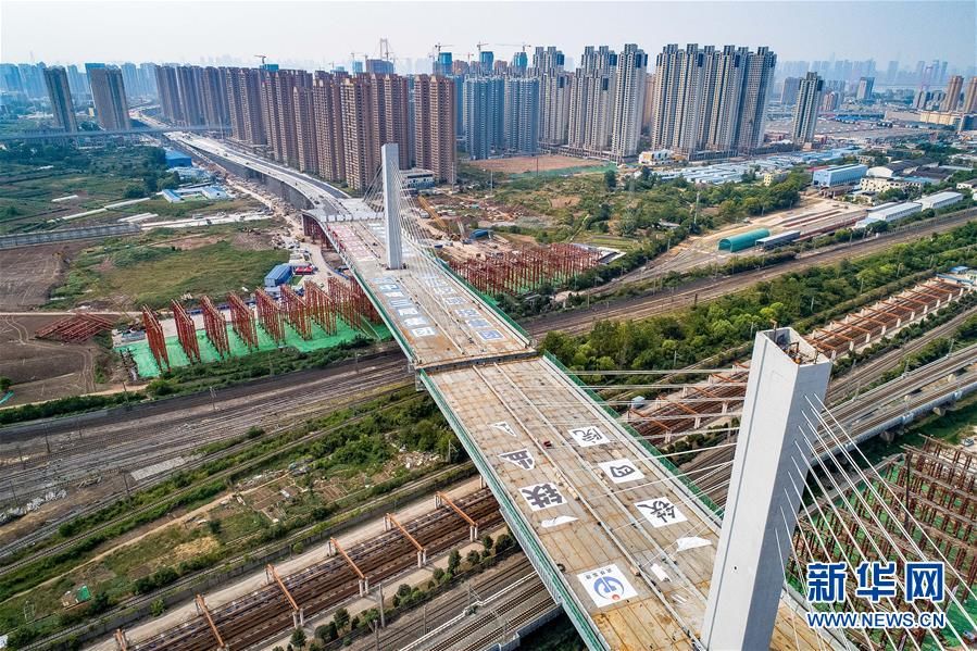 9月11日,武汉杨泗港快速通道青菱段跨铁路斜拉桥转体成功(无人机拍摄)。新华社记者 肖艺九 摄