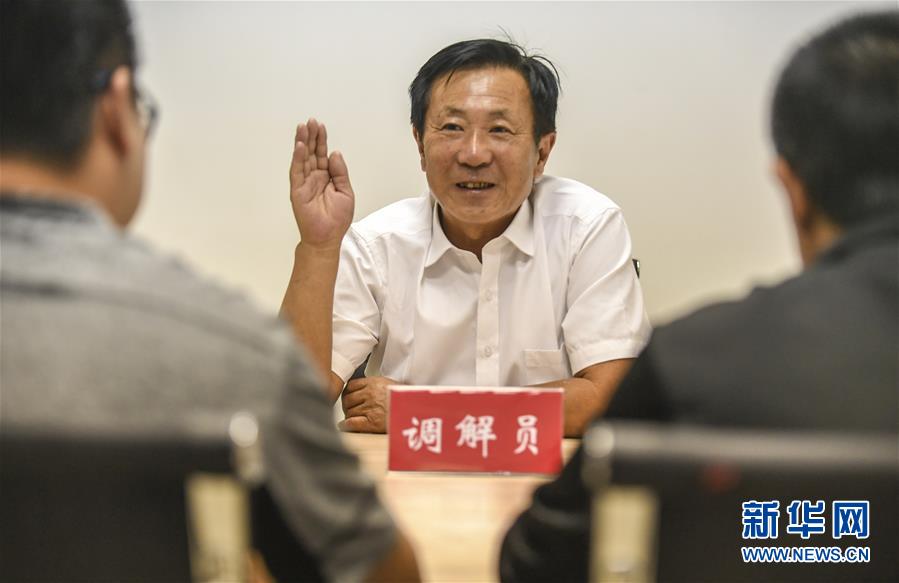9月11日,李宝清在调解室为村民进行调解。新华社记者 李晓果 摄