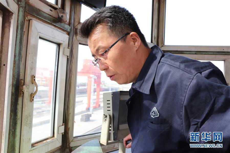 在起重机操作间内的姚建民(9月3日摄)。新华社记者 朱文哲 摄