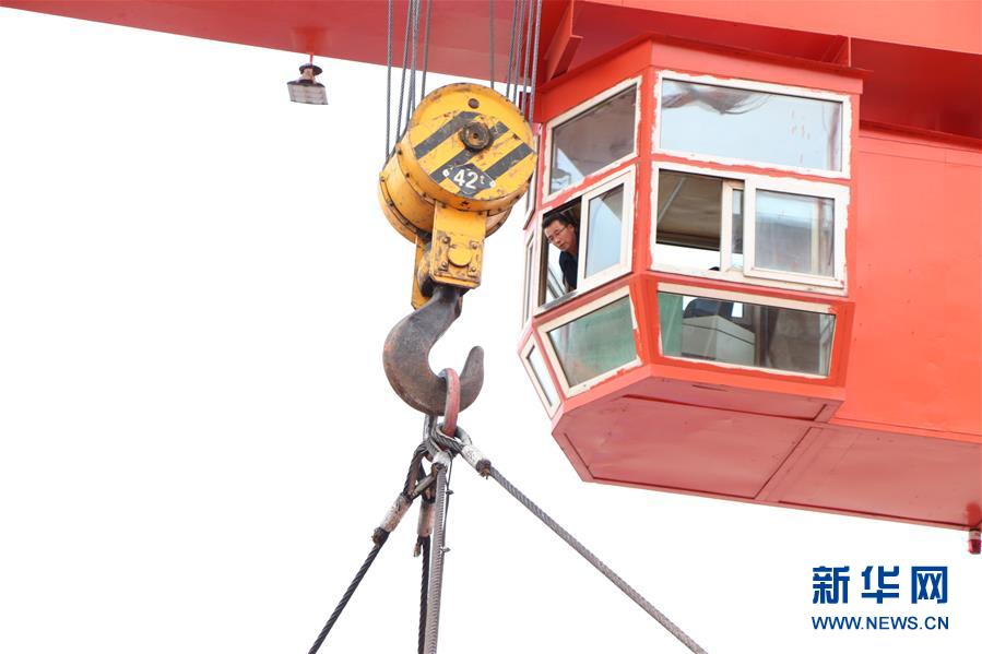 进行吊装作业时,姚建民经常需要探身观察集装箱的位置(9月3日摄)。新华社记者 朱文哲 摄