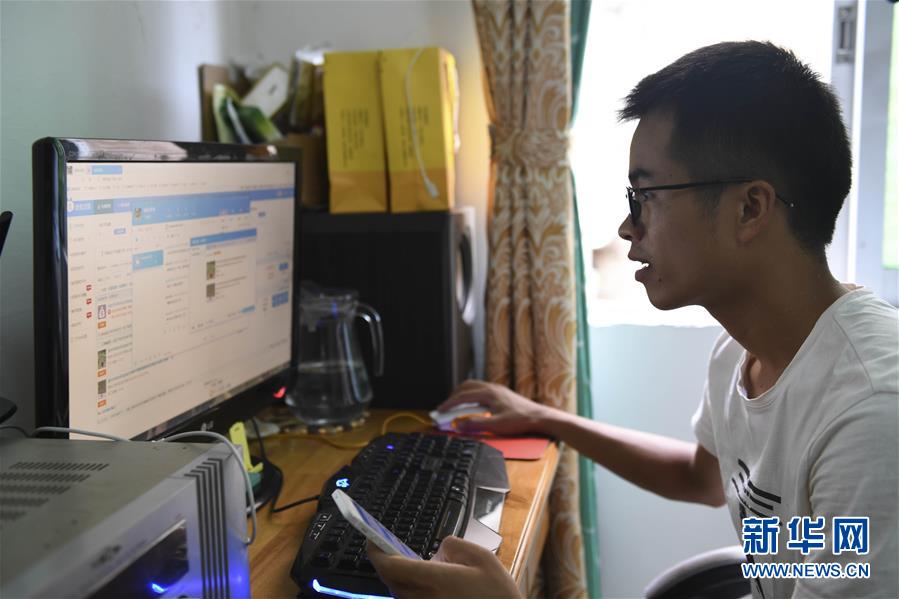 文森在位于兴业县北市镇兴福村的家中通过电商平台与顾客交流(8月15日摄)。 新华社记者 曹祎铭 摄