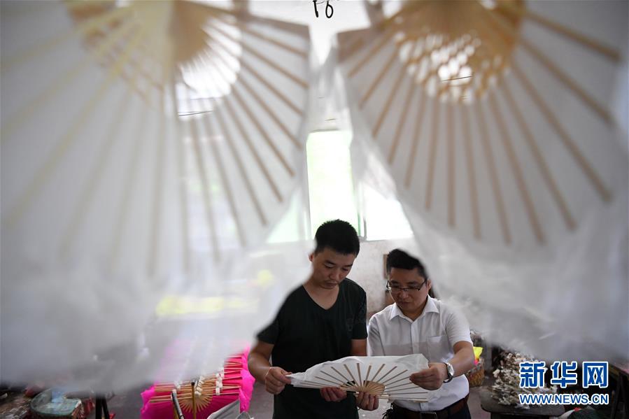重庆荣昌折扇制扇手艺人付爱东(右)、李道良在工坊里检查刚做好的折扇(9月11日摄)。