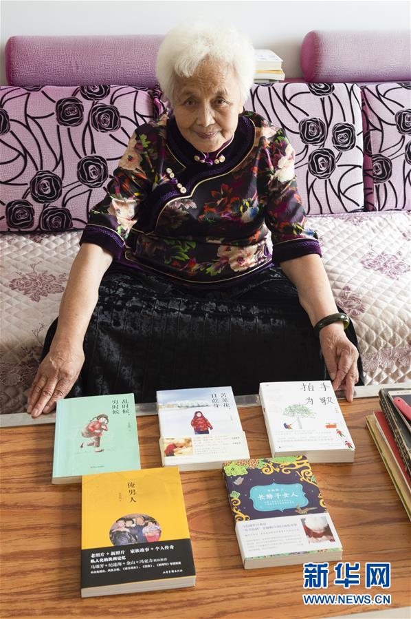 在黑龙江省绥化市北林区的家中,姜淑梅老人在展示她已经出版的5本书(9月12日摄)。 新华社发(谢剑飞摄)