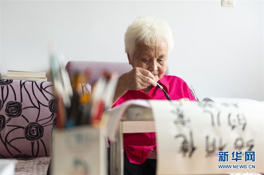 在黑龙江省绥化市北林区,姜淑梅老人在家中练完字后收起毛笔(9月12日摄)。 新华社发(谢剑飞摄)