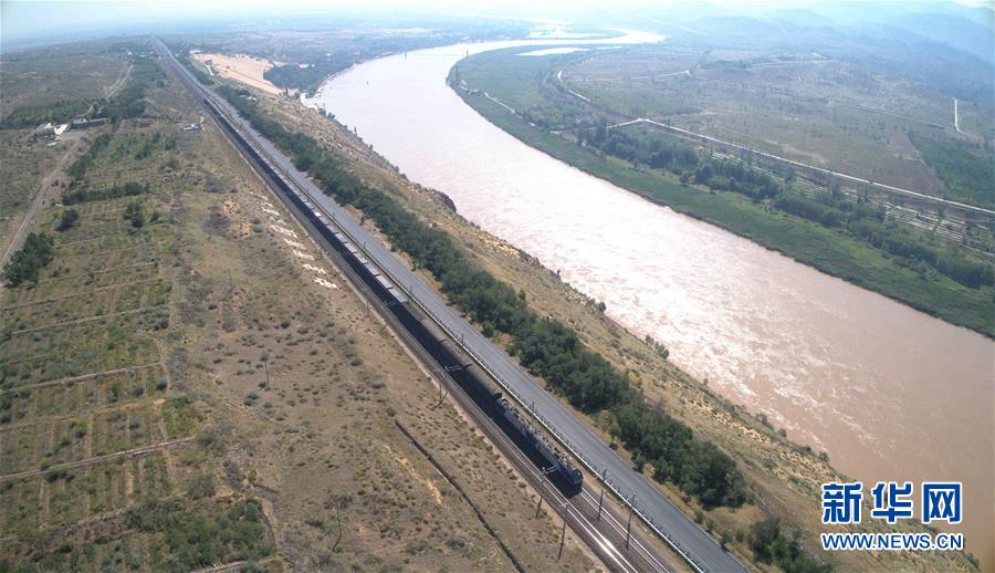 一列行驶在包兰铁路上的火车经过中卫沙坡头地区(8月31日无人机拍摄)。 新华社记者 刘诗平 摄