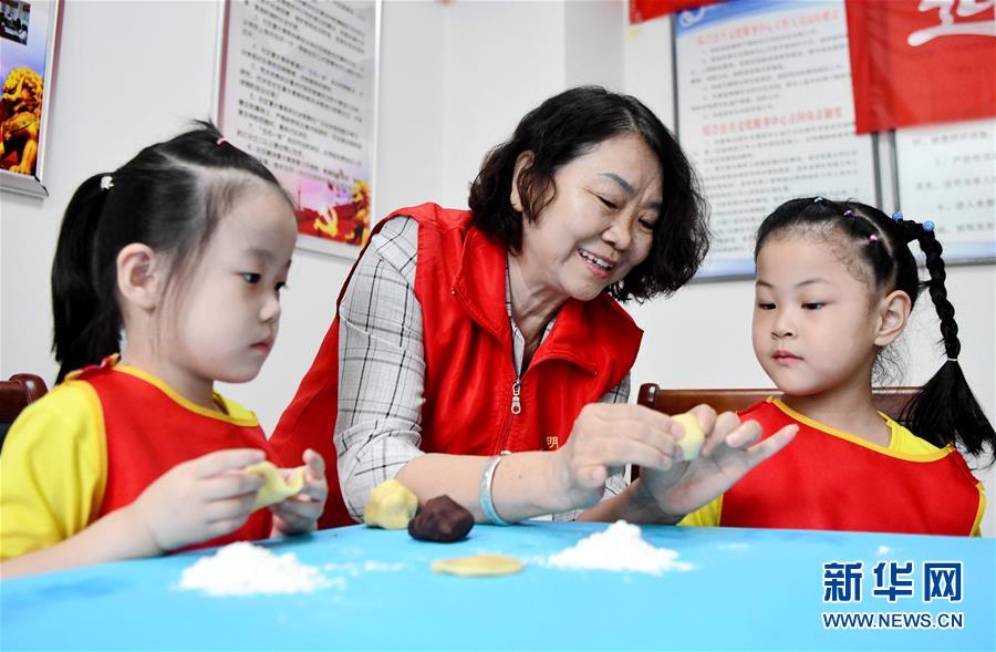 9月13日,河北省廊坊市安次区永华道街道蓝波湾社区开展“迎中秋 庆团圆”主题活动,小朋友在社区志愿者带领下学习制作月饼,欢度中秋佳节。 新华社记者 王晓 摄