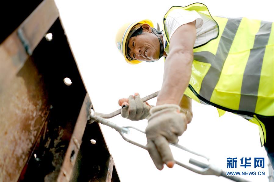 9月13日,工人在邢台市守敬路七里河大桥项目工地工作。 当日,河北省邢台市一些工地上的建设者依然坚守在工作岗位上。 新华社记者 朱旭东 摄