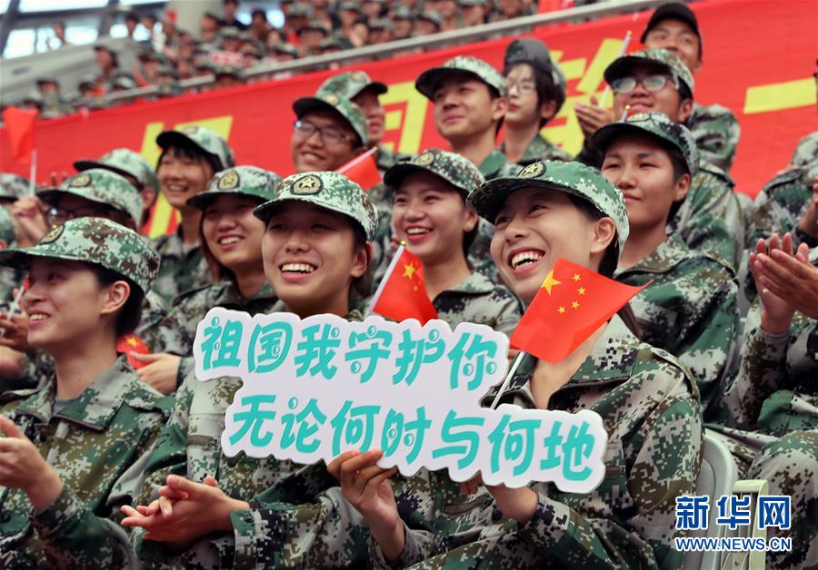9月13日,复旦大学军训学生在欣赏文艺演出。 当日,复旦大学2018级学生军训中秋文艺汇演在该校正大体育馆举行。参加军训的学生进行文艺演出,表达对祖国的祝福。 新华社记者 刘颖 摄