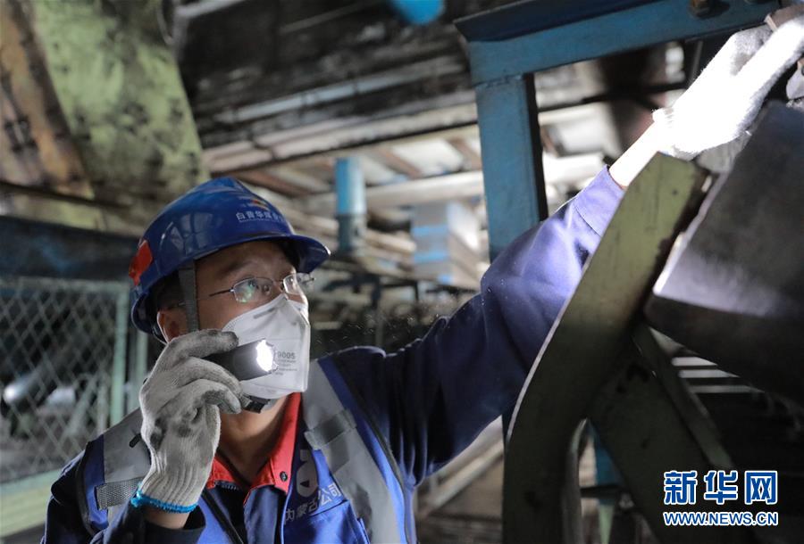9月13日,白音华煤业公司输煤皮带检修工王志强在检修皮带。 新华社记者 李云平 摄