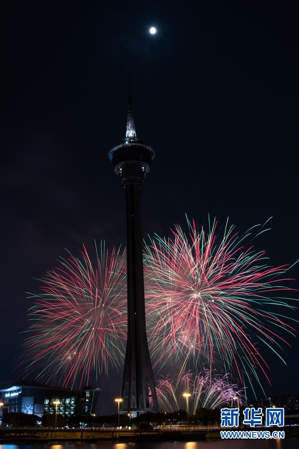 9月13日,烟火表演在澳门上演。 当日是中秋佳节,澳门市民和游客纷纷外出观赏彩灯和烟火,欢度佳节。 新华社记者 张金加 摄