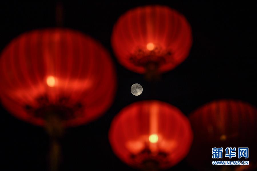 9月13日在香港维多利亚公园举行的彩灯会上拍摄的满月。 新华社记者 毛思倩 摄