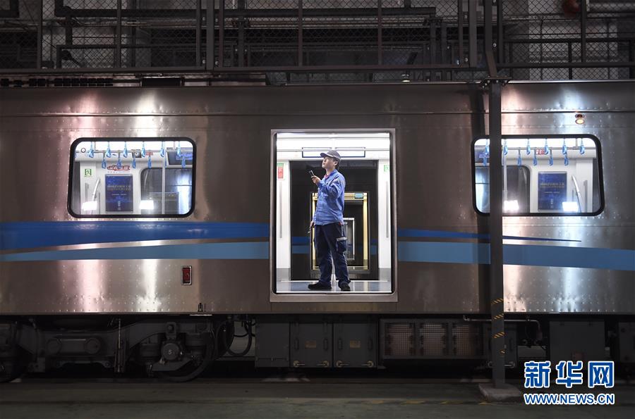 9月13日晚,车辆检修一车间综合3班的工人在对列车进行内装检查。