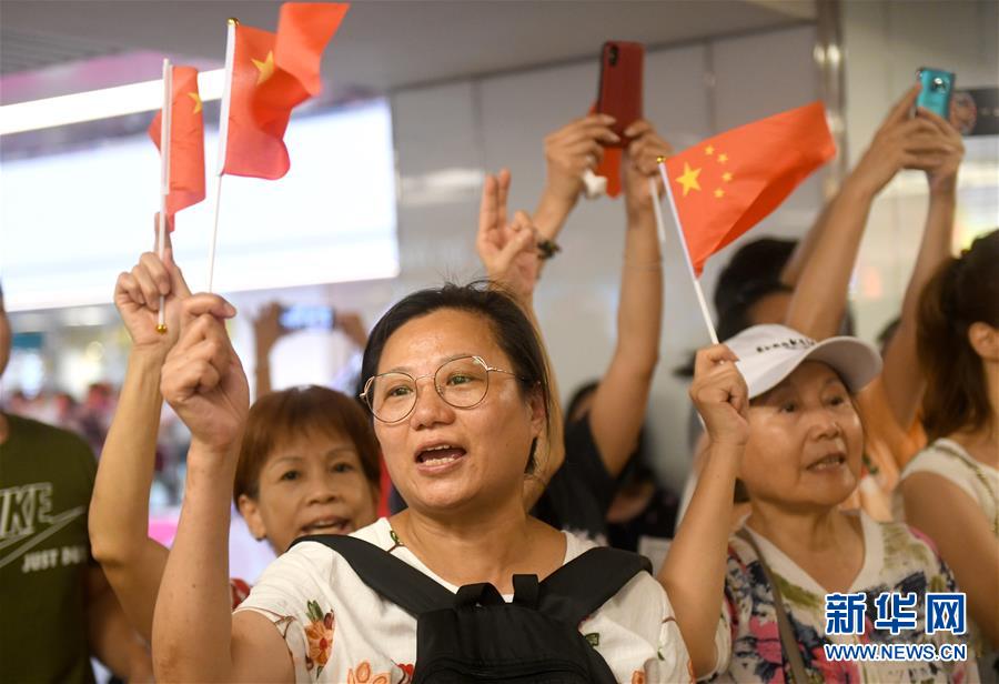 9月14日,市民在香港牛头角淘大商场挥舞五星红旗,齐声合唱国歌,声援此前在淘大商场内因唱国歌而被黑衣人袭击的香港教师李老师。 新华社记者 卢汉欣 摄