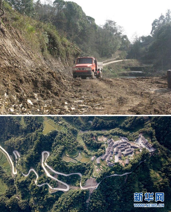 上图:脱贫前的花垣县十八洞村进村道路。摄于2011年12月。新华社发 下图:现在的花垣县十八洞村及其进村道路。摄于2019年9月。新华社记者 陈泽国 摄 新华社发