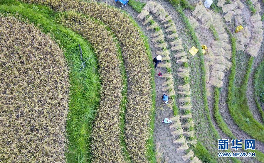 9月17日,贵州省榕江县计划乡计划村阳开苗寨的村民在收割稻谷(无人机拍摄)。