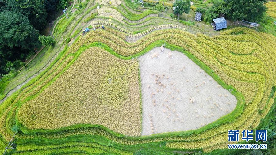 近日,贵州省黔东南苗族侗族自治州榕江县计划乡计划村阳开苗寨的水稻陆续成熟,农民们抢抓农时收割稻谷。从空中俯瞰,层层叠叠的梯田线条分明,与古朴的苗寨木楼相互映衬,美不胜收。 新华社记者 杨文斌 摄