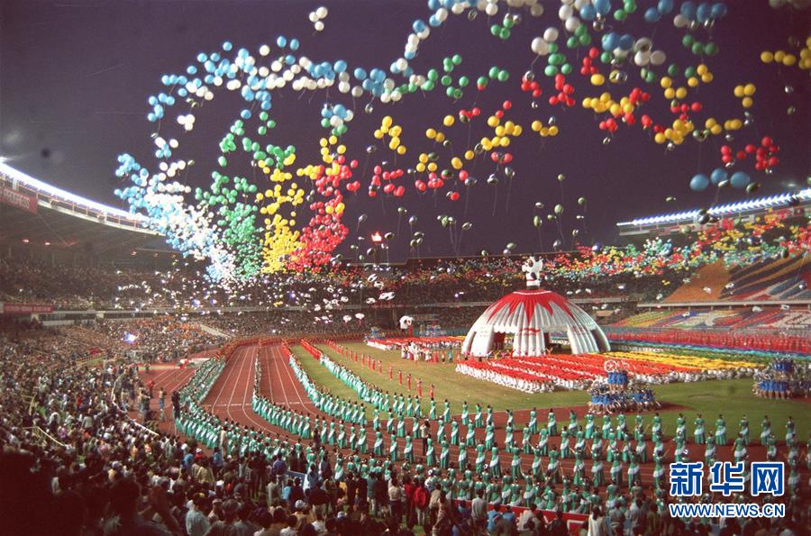 图为1990年9月22日,第十一届亚运会开幕式在北京工人体育场举行。 新华社记者何惠飞摄