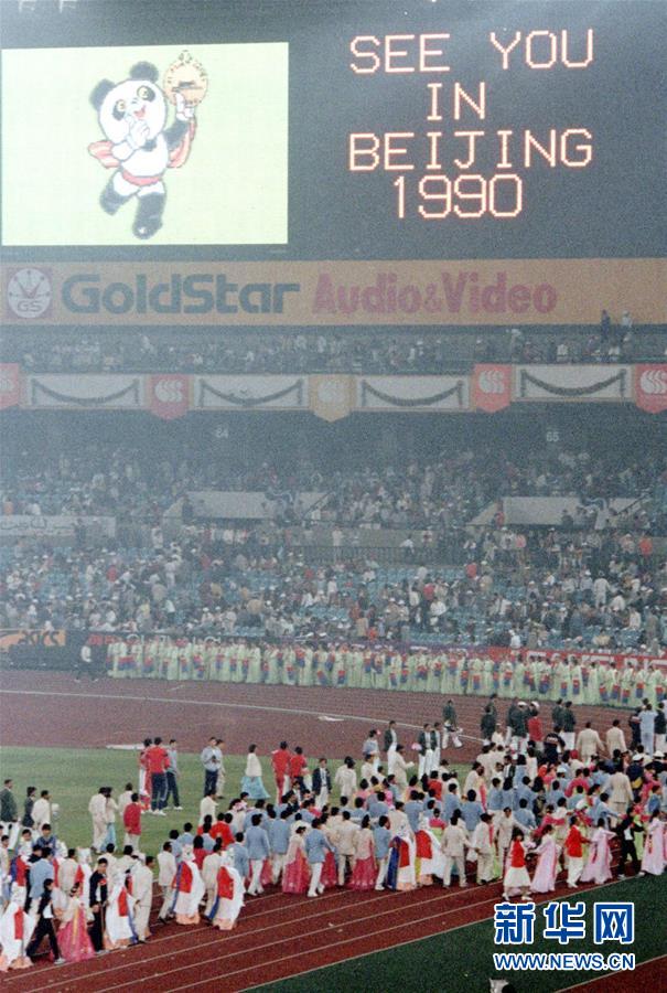 1986年10月5日,在汉城亚运会闭幕式上,大屏幕显示出“1990年再见在北京”字样和北京亚运会吉祥物——“熊猫盼盼”的图案。 新华社记者胡越摄