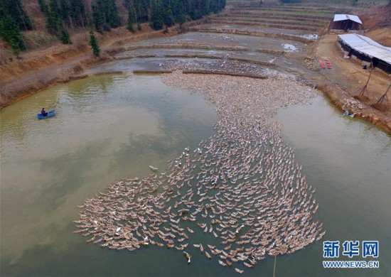 这是信阳市光山县文殊乡杜槐村金合欢林茶专业合作社麻鸭养殖基地(2018年3月17日无人机拍摄)。 近年来,河南省信阳市立足本地资源,推动“多彩田园”示范工程,建设美丽乡村,发展特色产业,走出了一条绿色发展的道路。 新华社记者 冯大鹏 摄