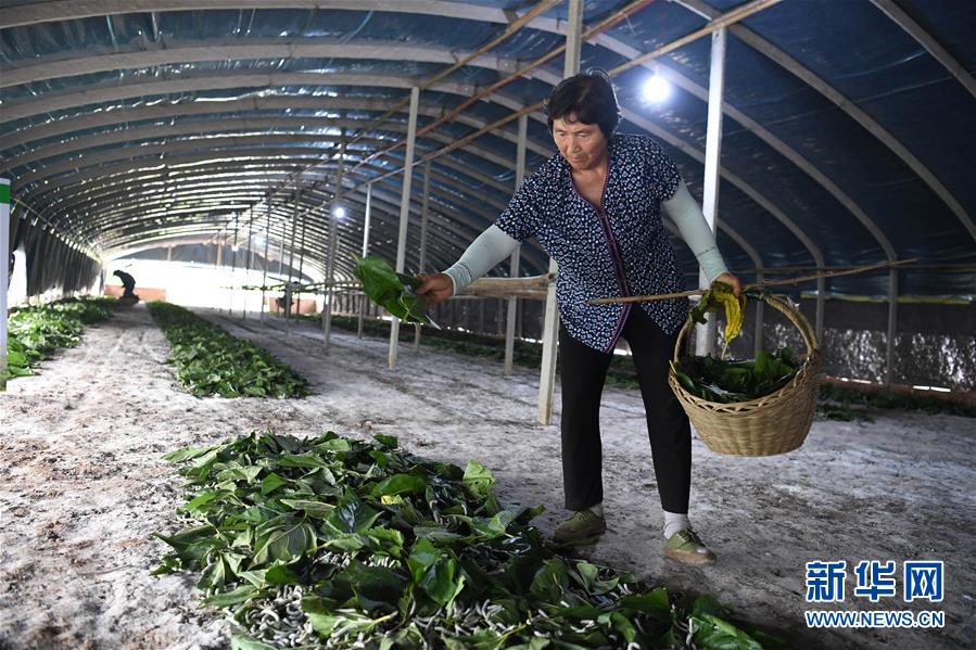 9月17日,安徽省肥西县金牛蚕桑农民专业合作社的农民为蚕添加桑叶。新华社记者 刘军喜 摄