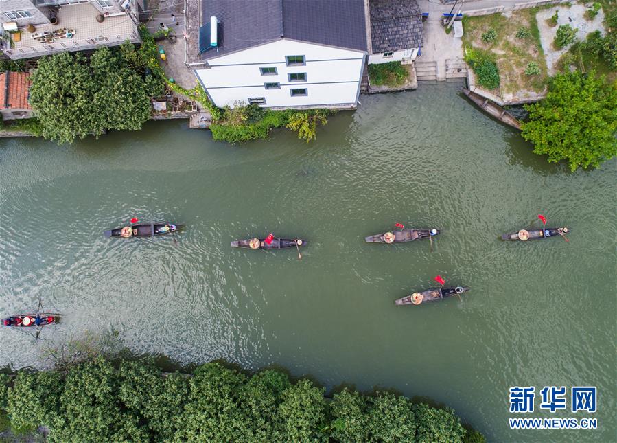 9月19日,塘栖镇丁河村的村民们划着渔船,带着玉米、南瓜、番薯等丰收的农产品,在村里的河道中进行巡游,用水乡特有的方式庆祝丰收时节的到来(无人机拍摄)。 当日,浙江省杭州市余杭区塘栖镇丁河村举办了一场水乡特色民俗庆丰收活动。村民举行了特色“新船礼”,并用小船载着丰收的农产品进行了水上巡游,用水乡特有的方式庆祝丰收时节的到来。 浙江省杭州市余杭区塘栖镇是千年水乡古镇,素来有“鱼米之乡”的美称。近年来,当地政府加大对河塘水体水质的治理以及基本农田建设,全镇4000多亩河塘水质得到提升,积极推进美丽乡村建设,乡村环境整体提升。 新华社记者 徐昱 摄