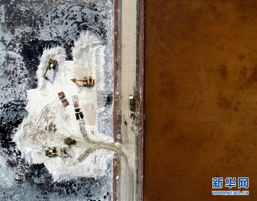 扒盐机停在天津长芦汉沽盐场盐池内(9月19日无人机拍摄)。 近日,天津长芦汉沽盐场开始秋季扒盐,鸟瞰阳光下一个个纵横排列的盐池,犹如色彩斑斓的调色板。 新华社记者 岳月伟 摄