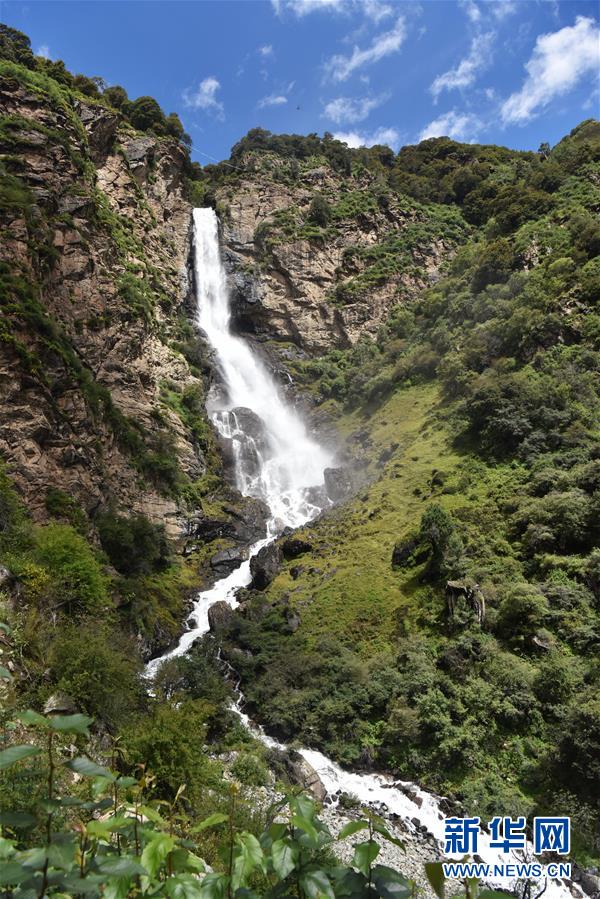 这是嘎贡瀑布(9月18日摄)。 嘎贡沟位于西藏林芝市朗县境内,融汇林海、花海、瀑布、湖泊、天然牧场等多种自然景观,旅游资源丰富独特。目前,嘎贡沟正在进行景区基础设施建设,未来将向游客开放。 新华社记者 周锦帅 摄