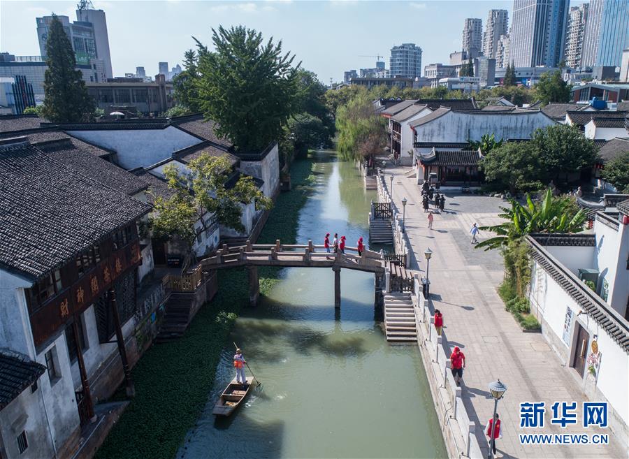 9月19日,爱山街道和朝阳街道的巡河小队志愿者对小市河进行巡查,对水面漂浮物、河中障碍物、河岸垃圾进行集中打捞清理,保持河道洁净。新华社记者 徐昱 摄