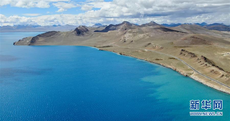 普姆雍错湖紧挨着公路,是自驾游的理想目的地(9月19日无人机拍摄)。 普姆雍错位于西藏山南市浪卡子县境内,海拔五千多米,在周围雪山融水的滋润和阳光的照耀下,美若少女。 新华社记者 晋美多吉 摄