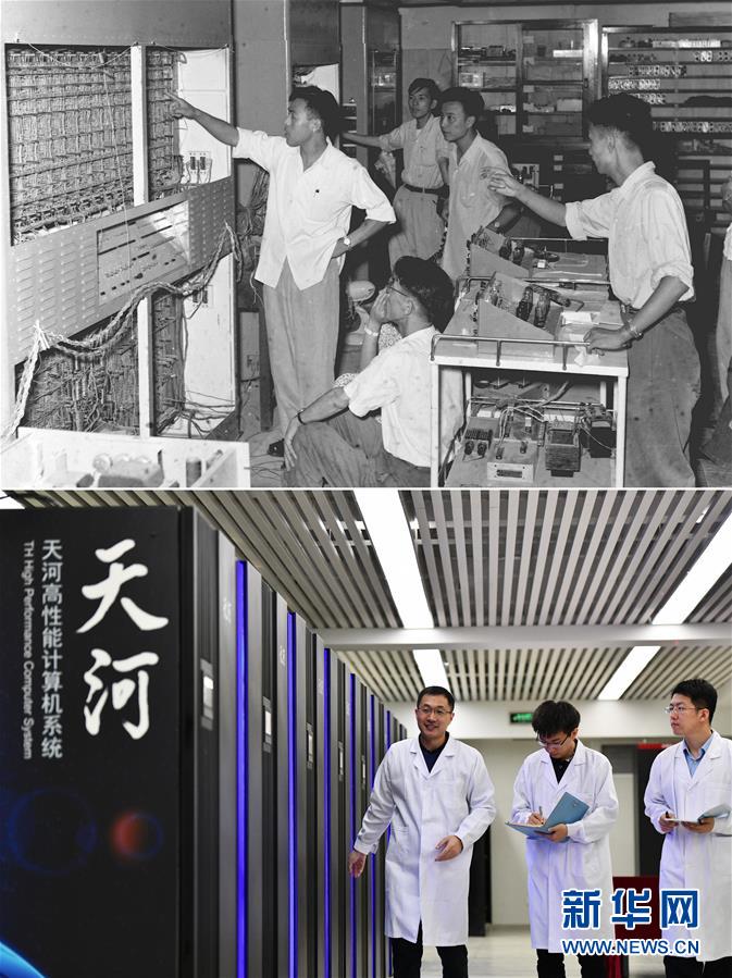 拼版照片:上图为1958年,中国科学院计算技术研究所和有关单位在苏联的技术援助下试制成功我国第一台通用电子计算机——“八一”型电子计算机。这是工作人员在观察运行工作中的通用电子计算机(新华社记者李基禄摄);下图为2019年4月24日,在国家超级计算天津中心“天河三号”原型机机房内,国家超级计算天津中心应用研发部部长孟祥飞(左)和同事一起巡查(新华社记者李然摄)。