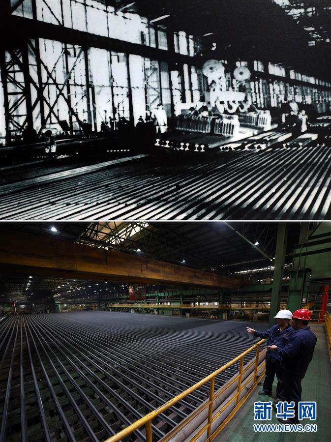 拼版照片:上图为上世纪50年代,鞍钢大型厂生产重轨的场景(资料照片);下图为2019年7月5日,工人在鞍钢集团鞍钢股份大型厂百米重轨生产线检查生产情况(新华社记者潘昱龙摄)。