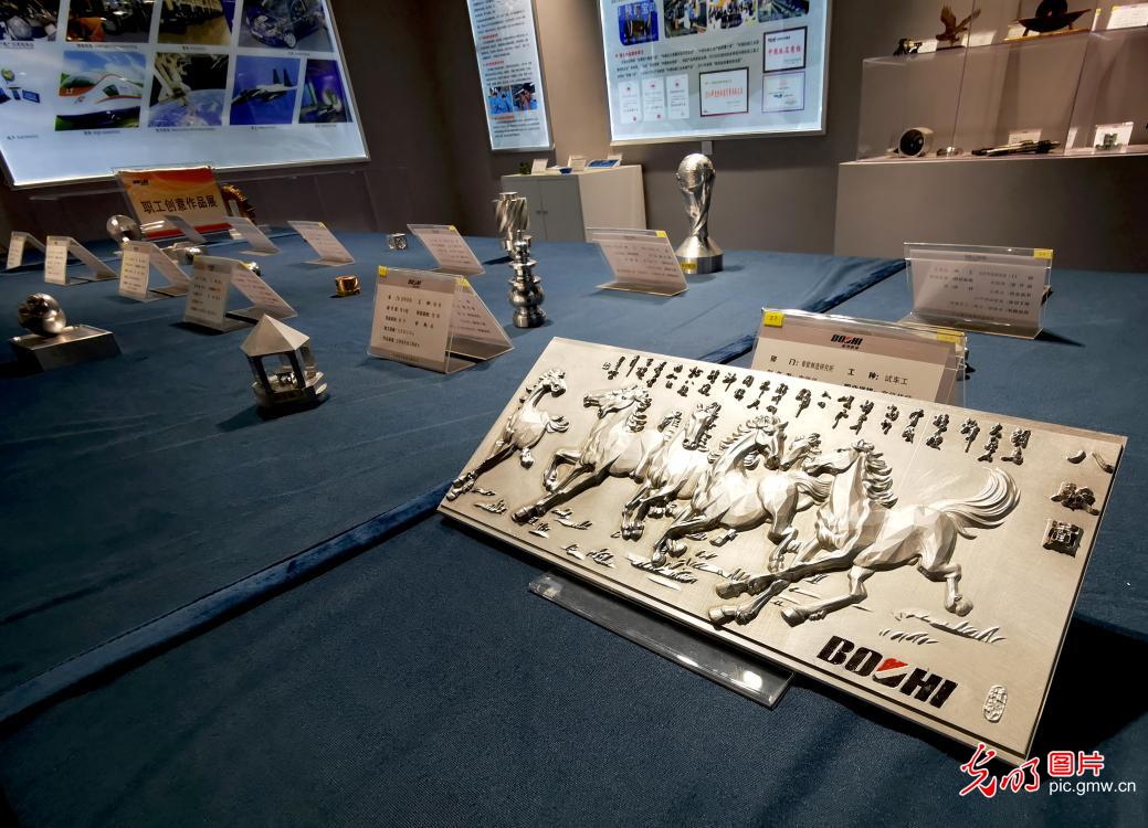 "有一次,南京的用户需要加工钻杆接头,他这个接头要求比较特殊,跑了国内好几家机床厂都没能试切成功,打听到我们有合适的机型,就慕名而来。"李晓佳讲起自己的工作,颇为自豪。"其实我也没加工过,客户说让我试试。当时他的语气神态比较失望,我心里就激起一股不服输的劲头,熬夜在厂里试切,实验做成了。客户当时还在回南京的火车上,一听我做成了,就马上带着现款回来签合同。"图为2019年9月3日,在宝鸡机床集团展示厅,李晓佳利用数控机床切割出的八骏图。( 孙云清摄/ 光明图片)