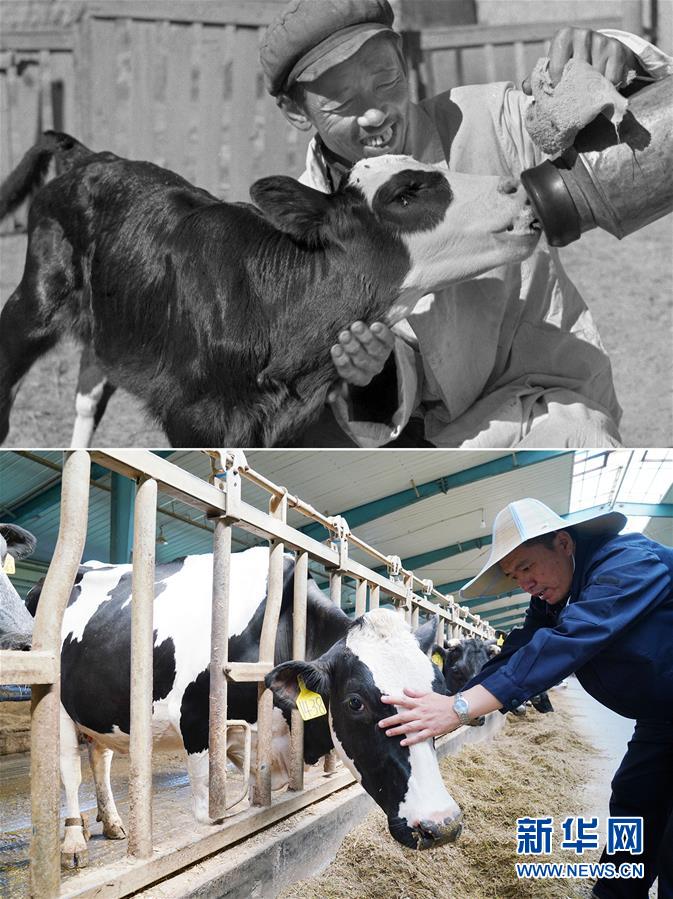 拼版照片:上图为1962年,黑龙江红色草原牧场星火牛场第二生产队饲养员王德成拿着奶瓶喂刚生下4天的犊牛(新华社记者胡伟摄);下图为2019年7月10日,黑龙江省牡丹江市红星有机森林牧场的牛舍内,工作人员张德玉在检查奶牛身体情况(新华社记者王建威摄)。