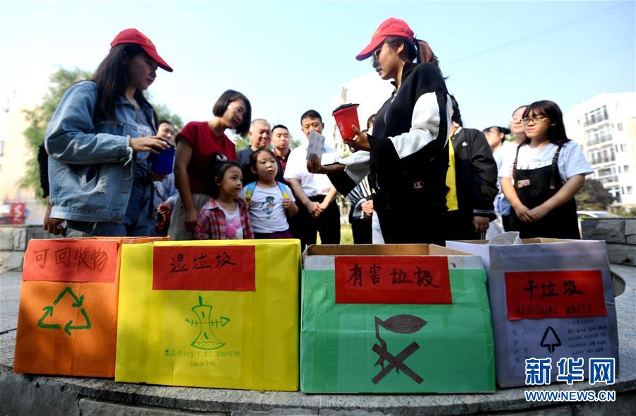 9月21日,在廊坊市安次区文苑小区,志愿者向居民普及生活垃圾分类知识。 当日,河北省廊坊市安次区开展“垃圾分类宣传进社区”活动,社区工作人员和志愿者为辖区居民发放宣传手册,讲解垃圾分类知识。 新华社记者 王晓 摄