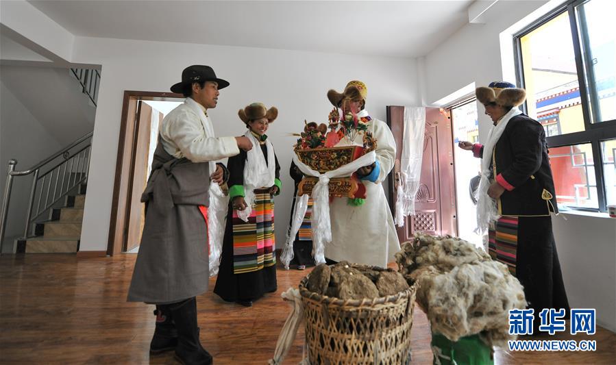 9月21日,搬进新居的村民在举行新房入住仪式。 当日,在西藏山南市洛扎县洛扎镇,次麦居委会的28户共88名村民领到次麦社区边境小康村崭新二层藏式新房的钥匙,极大改善了住宿条件。按照人均40平方米标准建设的次麦社区边境小康村,建设面积约为3824.08平方米,工程造价1546.15万余元。除了人均2.4万元的自筹资金外,新房其他费用都由政府扶持。 新华社记者 晋美多吉 摄