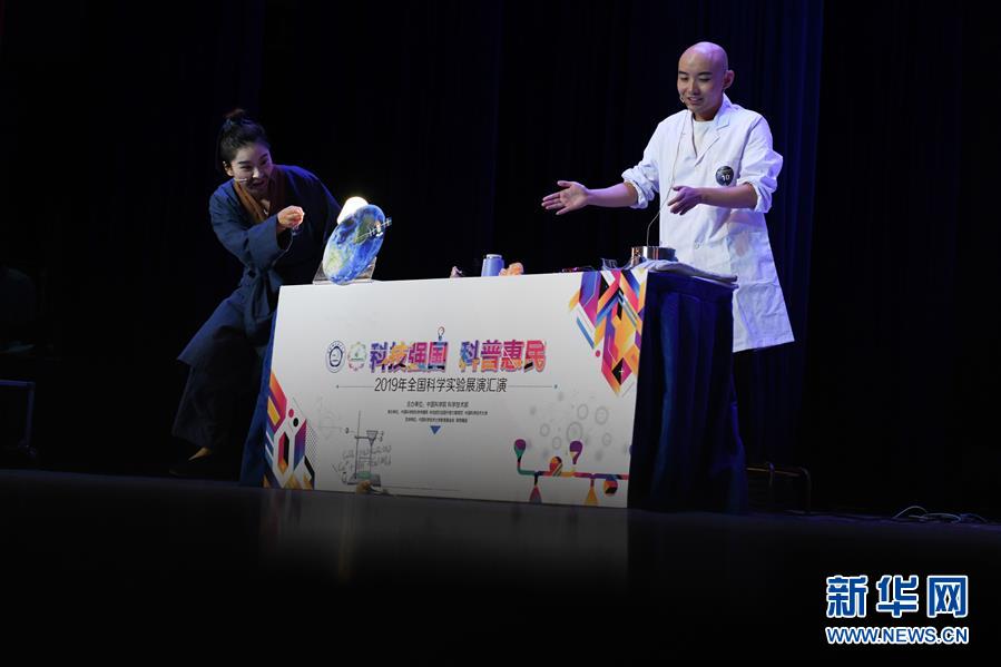 9月21日,在位于安徽合肥的中国科学技术大学,来自陕西省科学技术厅的实验展演团队成员在进行科学表演秀《万户奇遇记》。 当日,主题为“科技强国 科普惠民”的2019年全国科学实验展演汇演活动在中国科学技术大学东校区举行。来自全国各地的实验展演团队为观众呈现了一场妙趣横生的科学表演秀,旨在向全社会普及科学知识,弘扬科学精神。 新华社记者 张端 摄