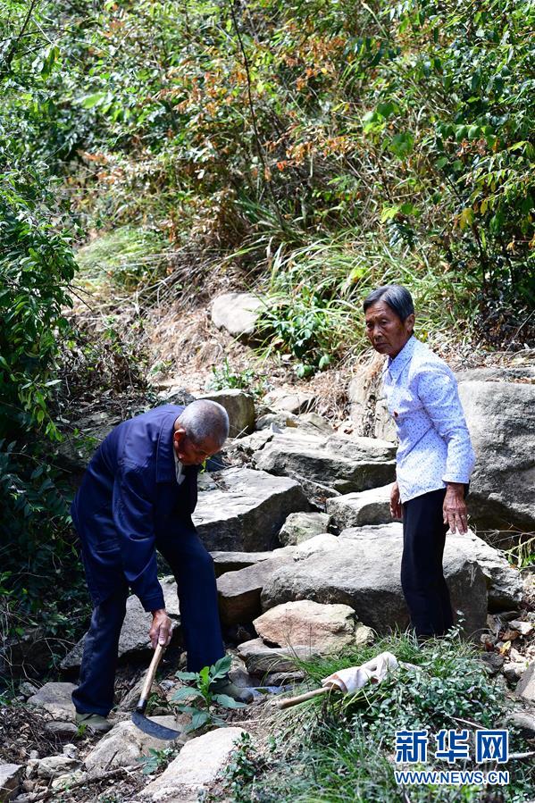 9月20日,在郭家河乡湾店村,张爱华(右)和潘国章正在修整登山的道路。 新华社记者 冯大鹏 摄