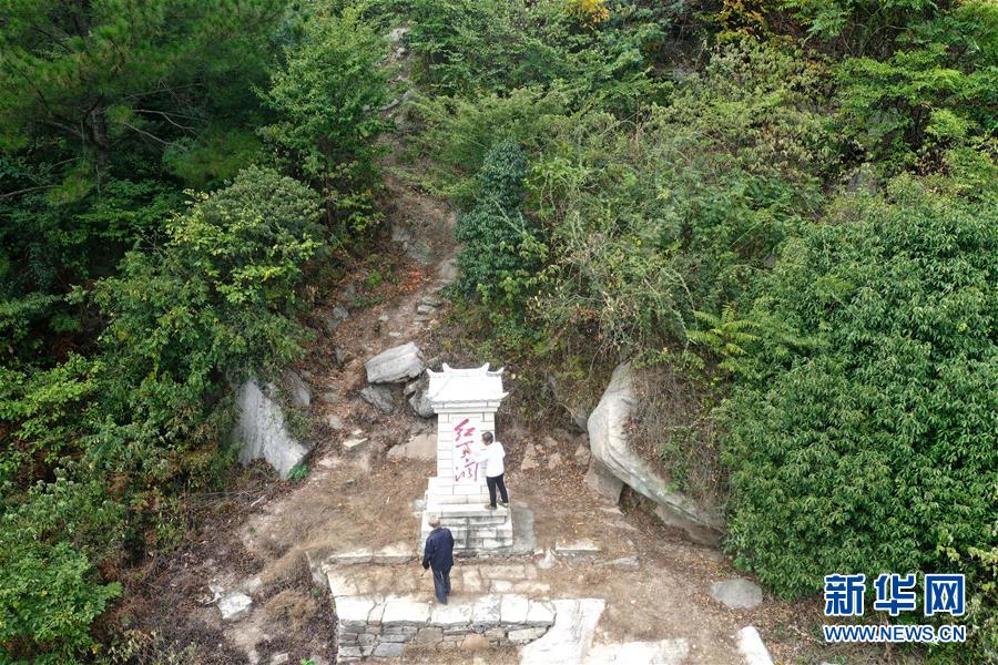 在郭家河乡湾店村,张爱华(右)和潘国章查看“红军洞”石碑(9月20日无人机拍摄)。 新华社记者 冯大鹏 摄